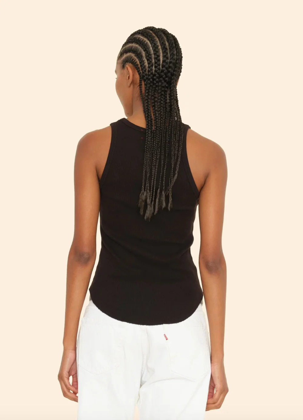 Made in fine cotton rib knit, this soft cut away tank has a raw shirttail hem and is a staple layering piece.