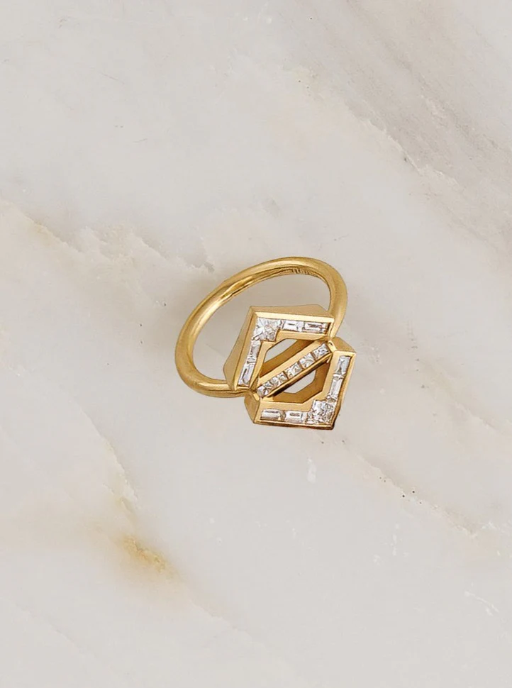 Made and hand-finished in LA, 18k yellow gold ring featuring white baguette and princess cut diamonds.