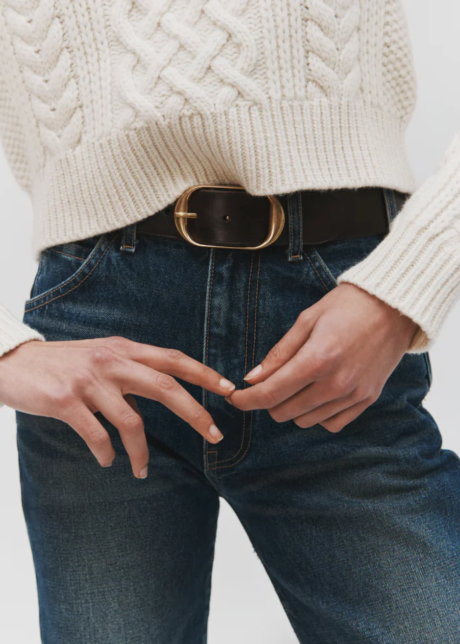 Wide belt in cowhide leather. Solid antique brass buckle in matte gold finish. Contoured to fit around the natural shape of the waist.