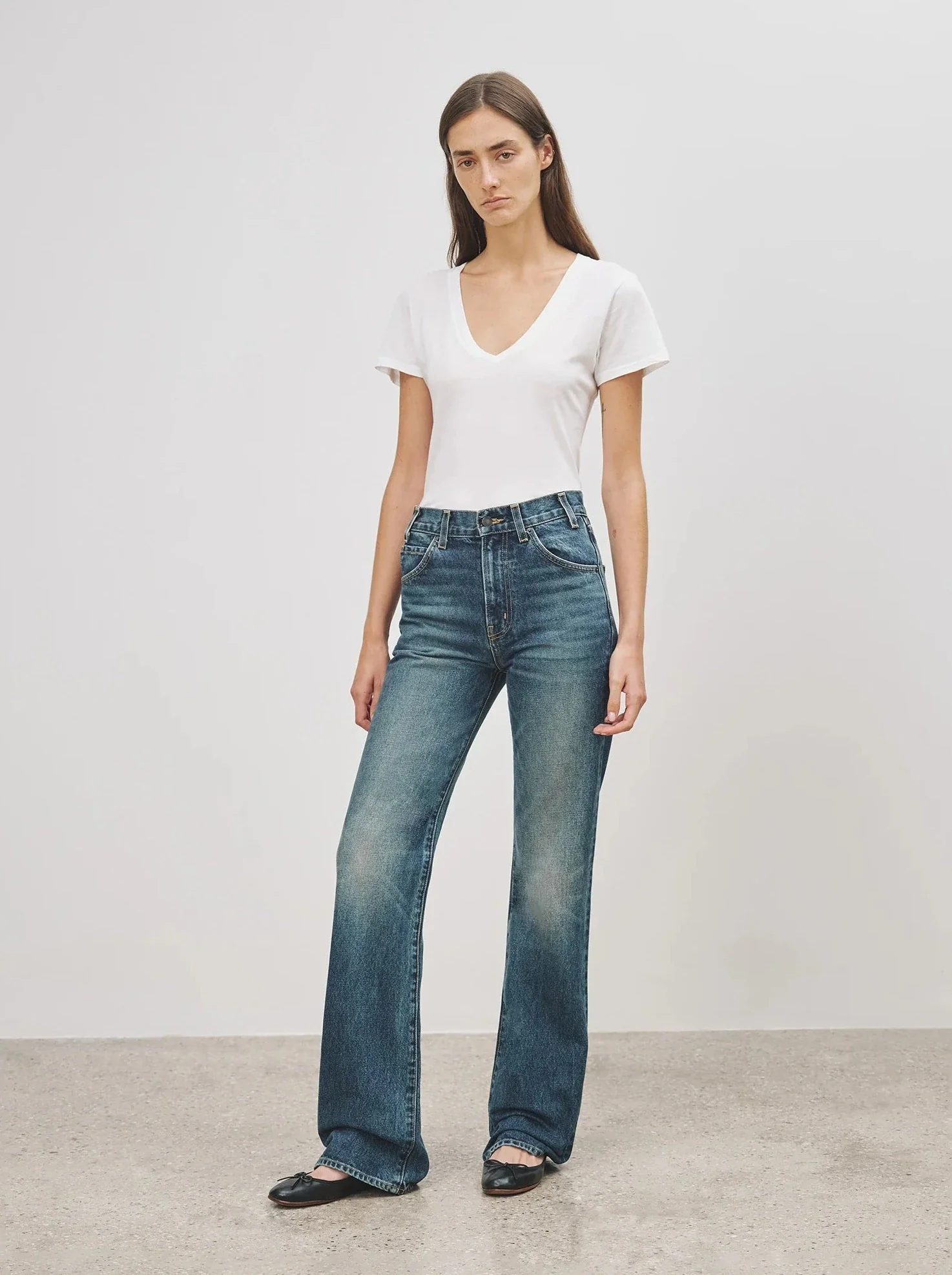 High-waisted, slim straight leg jean in non-stretch Japanese heavyweight crosshatch denim. Designed for a longer inseam.