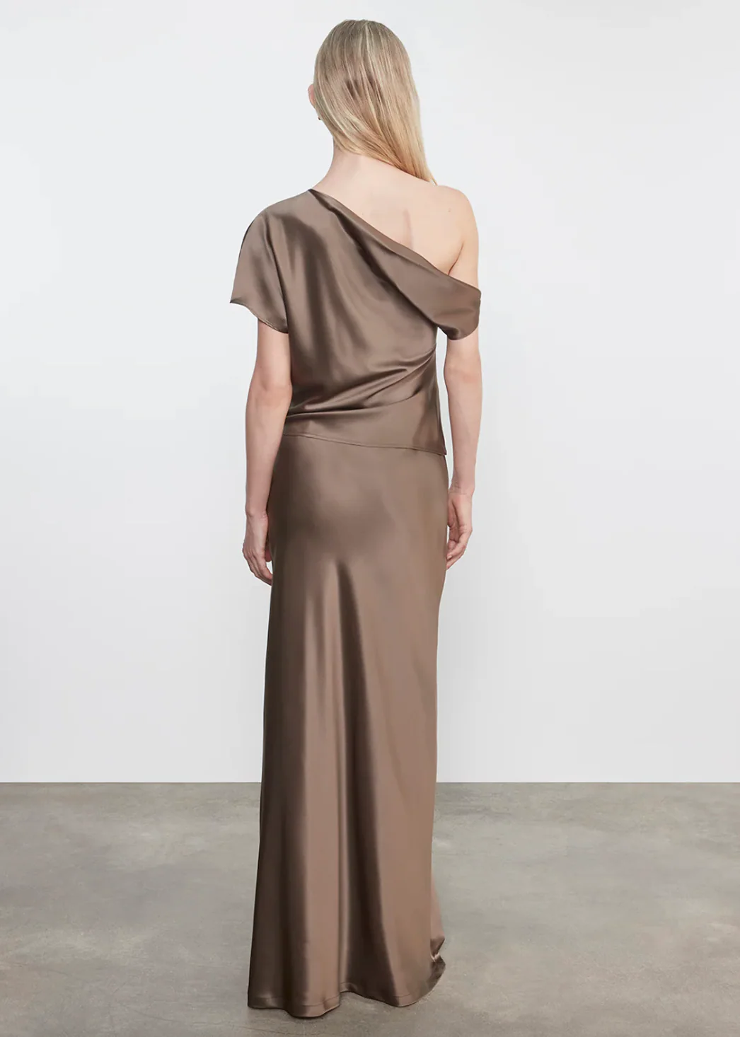 Crafted from 100% silk satin, this top features a sweeping drape that cascades from one shoulder, creating a modern, softly sculptural silhouette. Pairs perfectly with the Silk Full Length Skirt in Mushroom by Enza Costa.