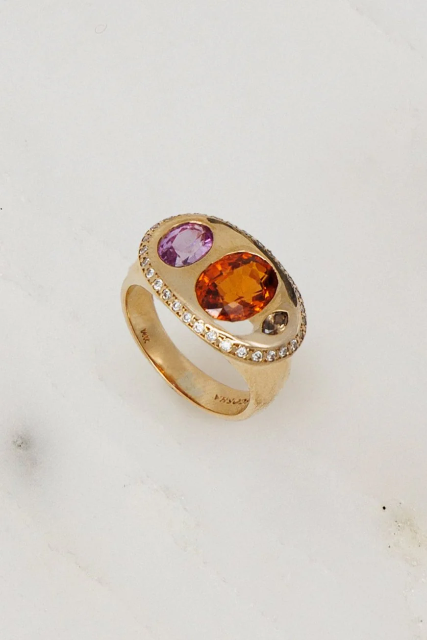 Cast from solid 14k yellow gold set with a bright mandarin orange garnet, a rose cut oval pink sapphire, and marquise champagne diamond. A pave diamond halo adds extra dimension and sparkle.